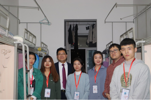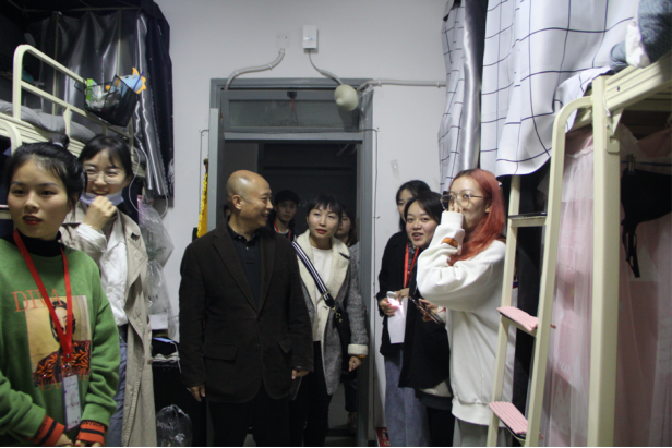 (院长唐勇查看同学们的宿舍卫生情况)